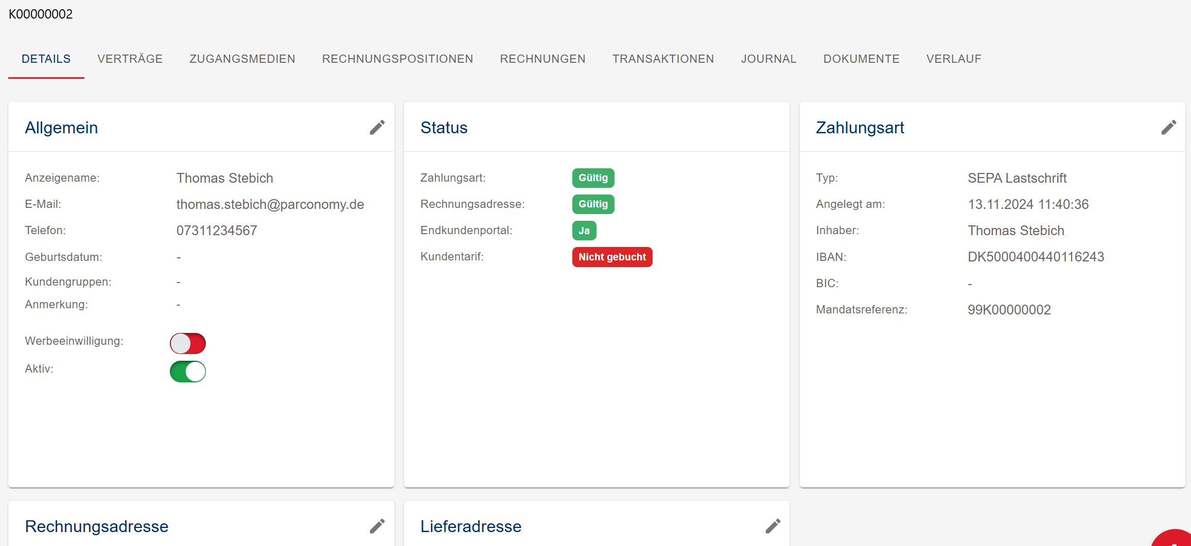 Über den Stift neben der jeweiligen Information können Sie Eingaben, wie allgemeine Informationen, Rechnungsanschrift, Lieferadresse, usw. nach Kundenwunsch ändern. Im Anschluss sichern Sie die geänderten Informationen ab mit Speichern.