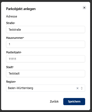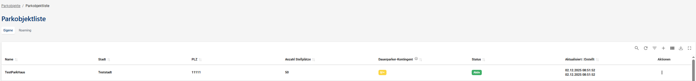 4. Nach Eingabe aller Daten klicken Sie auf "Speichern", um das Objekt anzulegen. Danach klicken Sie in der Tabelle auf das neu angelegte Parkobjekt, um weitere Daten zu hinterlegen.