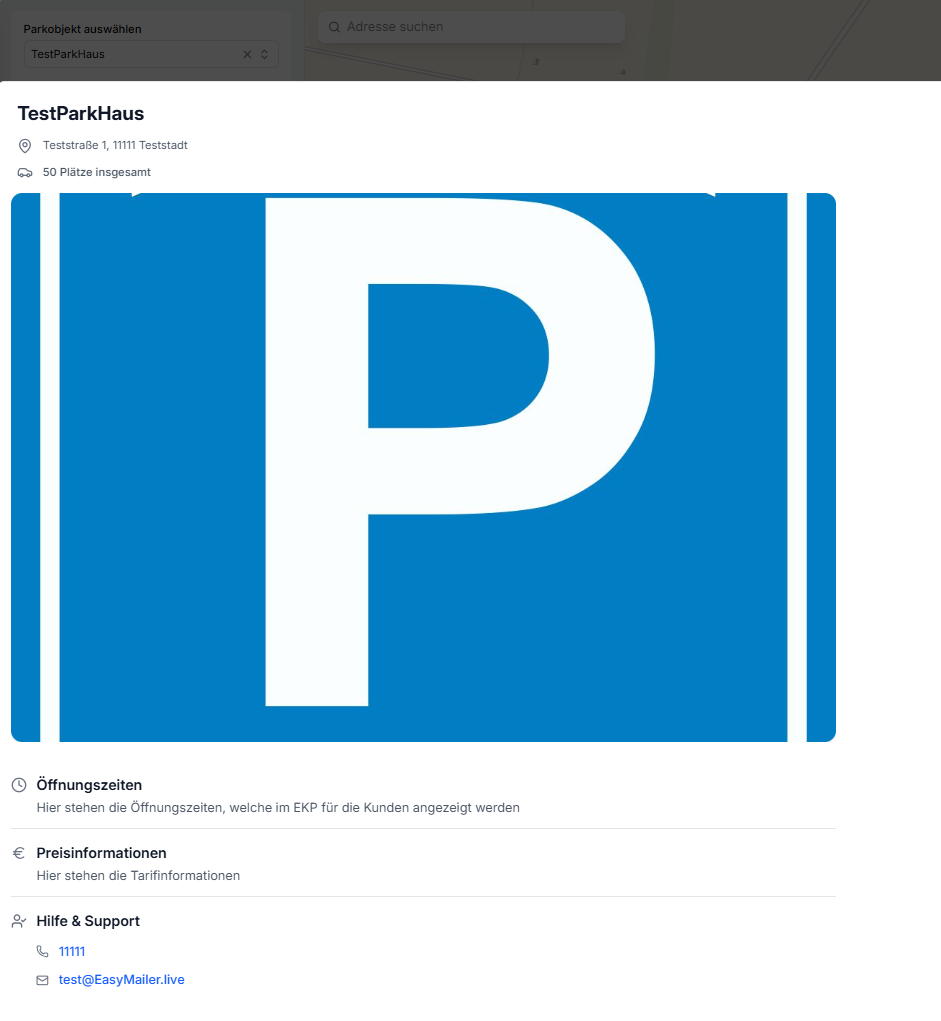 Im Endkundenportal auf der Parkobjektkarte gelangt man durch ein Klick auf das angelegte Parkobjekt zu der Übersicht mit den hinterlegten Informationen