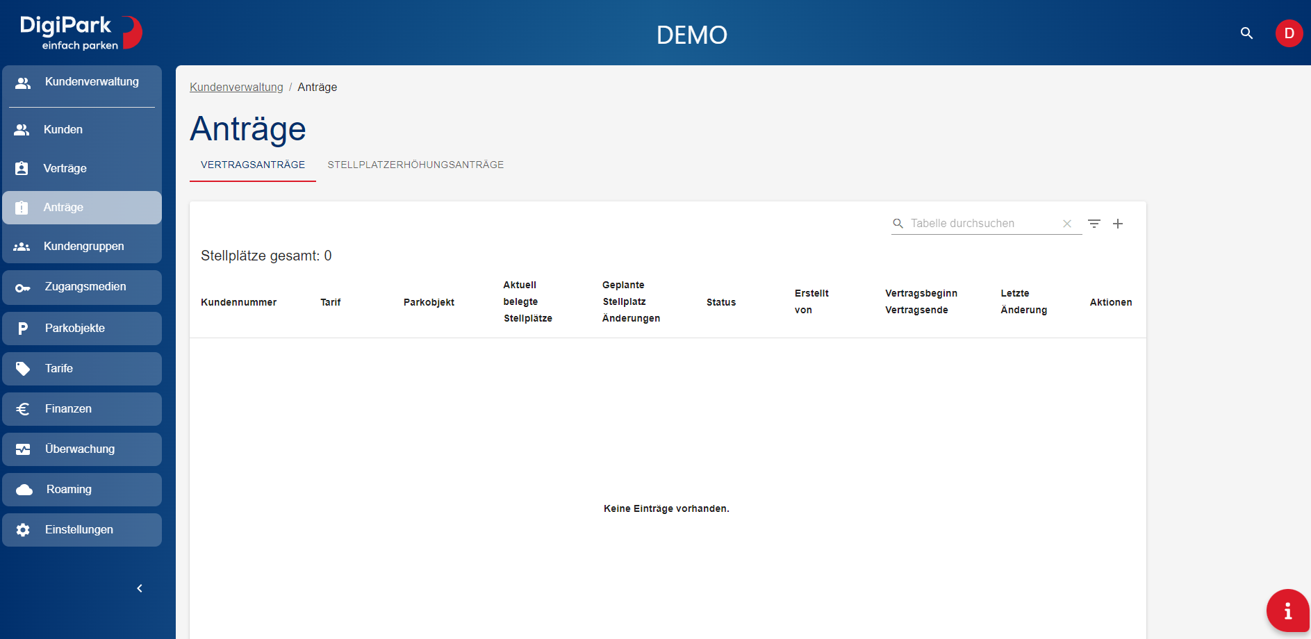 Diese Ansicht ist ist unterteilt in Anträge für Verträge und Anträge für Stellplatzerhöhungen für einen bestehenden Vertrag.