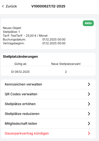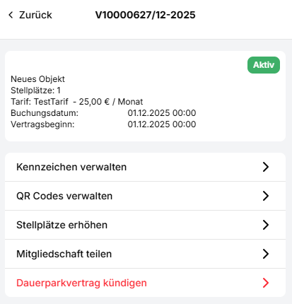3. Der Status des Vertrags ändert sich von "Aktiv" auf "Gekündigt", sobald Ihr Parkhausbetreiber die Kündigung akzeptiert hat.
