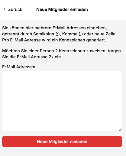 2. Durch einen Klick auf "Neue Mitglieder einladen" gelangen Sie in eine neue Übersicht, in der Sie E-Mail-Adressen eintragen können und durch einen Klick auf "Neue Mitglieder einladen", die Einladungen versenden. Die eingeladenen Mitglieder erhalten im Nachgang eine E-Mail mit einem Link. Unter diesem Link kann dann ein Kennzeichen eingetragen werden, mit welchem man in das Parkhaus fahren kann.
