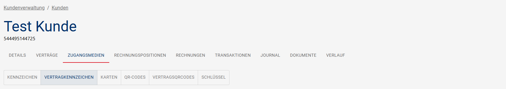 1. Gehen Sie im gewünschten Kunden in den Bereich Zugangsmedien. Klicken Sie, abhängig von dem gewünschten Medium, auf Vertragskennzeichen oder Vertrags-QR-Codes.